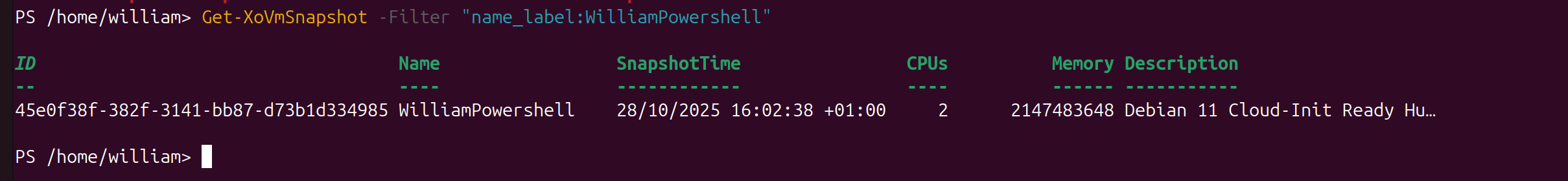 Get-XoVmSnapshot -Filter "name_label:your-snapshot-name"